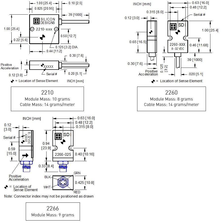 2210型號采用了標準的1英寸方形封裝,而2260和2266則是為適應(yīng)緊湊空間設(shè)計的小尺寸產(chǎn)品。其中,2210和2260配備了集成的3英尺電纜,2266則配置了可定制電纜長度并方便重新定位的連接器。所有這三個型號都使用了密封且低噪音的SDI表面貼裝加速計,并由SDI進行了單獨的測試、編程與校準。