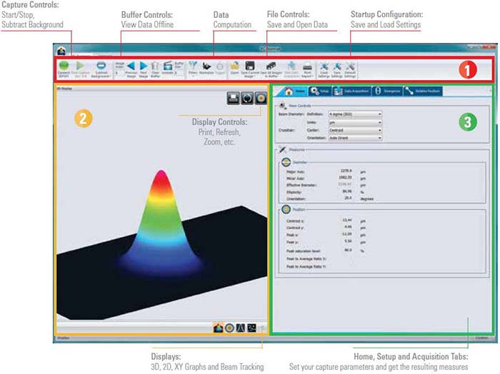 3 - 主頁和設(shè)置選項(xiàng)卡 —— 軟件右側(cè)包含主頁、設(shè)置和數(shù)據(jù)采集選項(xiàng)卡。主頁選項(xiàng)卡允許用戶選擇針對(duì)其測(cè)量的主要控制(光束直徑清晰度、瞄準(zhǔn)器中心和定向),并在其下顯示測(cè)量結(jié)果。設(shè)置選項(xiàng)卡允許用戶設(shè)置測(cè)量參數(shù)(曝光時(shí)間、圖像定向和平均值、主動(dòng)區(qū)等),數(shù)據(jù)采集選項(xiàng)卡允許用戶保存測(cè)量值或測(cè)量值及完整圖像,并輸入采集的采樣率和總持續(xù)時(shí)間。單擊計(jì)算面板中的顯示/隱藏選項(xiàng)按鈕,還可調(diào)出具有控制功能的更多選項(xiàng)卡。