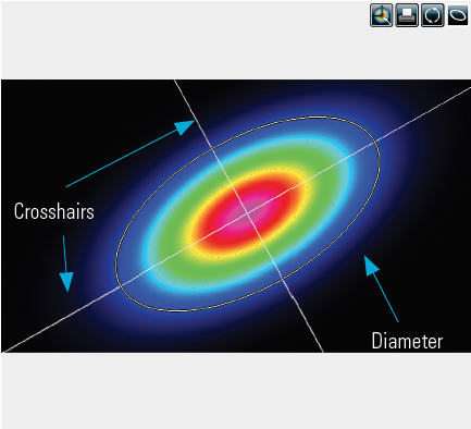 二維顯示屏 —— 二維顯示屏可顯示瞄準(zhǔn)器(設(shè)置到長(zhǎng)軸和短軸或沿指定角度方向)和光束的測(cè)定直徑。這些直徑隨所選清晰度(4-sigma、半峰全寬、1/e2 等)而變化,該顯示屏可以打開或關(guān)閉。打印屏幕按鈕允許用戶以 BMP 格式保存當(dāng)前屏幕的圖片。