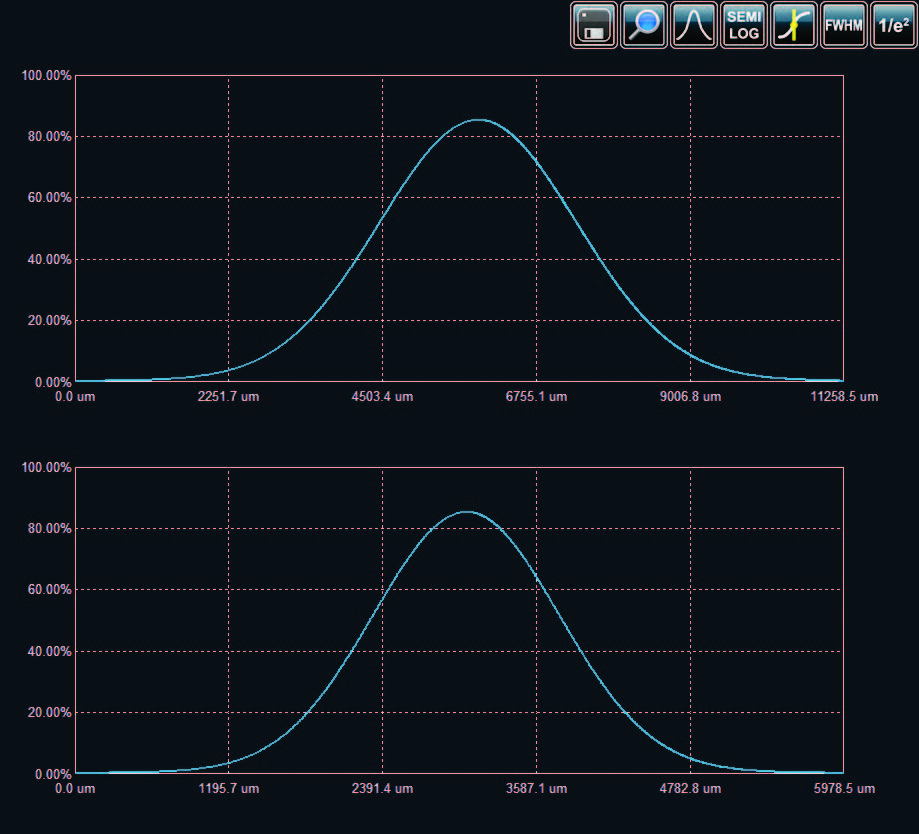 XY 顯示屏 —— XY 顯示屏繪制沿瞄準(zhǔn)器的光束橫截面圖。其具有很多有用工具,包括縮放、光標(biāo)、半峰全寬和 1/e2 級(jí)別條。另外還可以半對(duì)數(shù)格式顯示圖形,以增強(qiáng)光束低強(qiáng)度部分的細(xì)節(jié)。