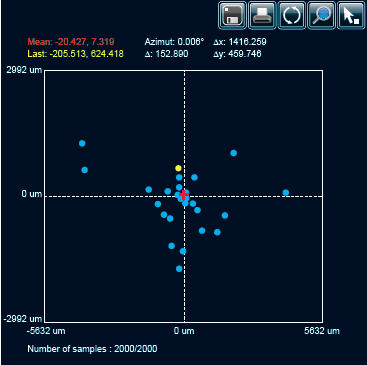 光束跟蹤顯示屏 —— 光束跟蹤顯示屏允許用戶對(duì)光束在傳感器上中心位置的變化進(jìn)行可視化顯示。其可顯示最后計(jì)算位置和以前的位置,除非用戶重置視圖。另外還可顯示所有計(jì)算值的平均數(shù)位置,并提供有關(guān) X 軸和 Y 軸位置穩(wěn)定性的信息。此工具非常適合于監(jiān)控光束隨時(shí)間變化的指向穩(wěn)定性。