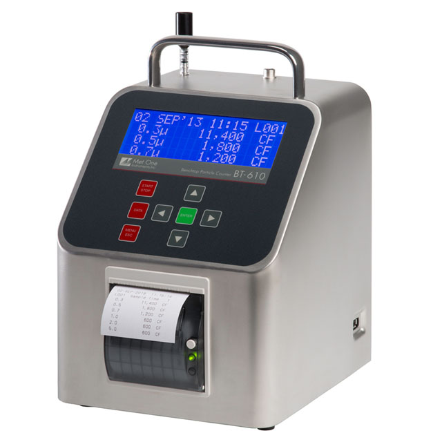 Met One 的 BT-610 有一個帶有很大字符的大顯示屏、音頻報警器和內(nèi)部打印機,它們一起工作以確定和記錄微粒水平。如果顆粒計數(shù)多于預先設定的限度,聲音警報會發(fā)出蜂鳴聲,屏幕顯示會閃爍,打印機會打印出警報值??梢栽O置兩個可編程計數(shù)報警限值。用戶可以選擇尺寸并分別設置六個通道中的每一個,范圍為 0.3 至 2.0 微米,增量為 0.1 微米,以及 2.0 至 10 微米,增量為 0.5 微米。不需要自定義校準。