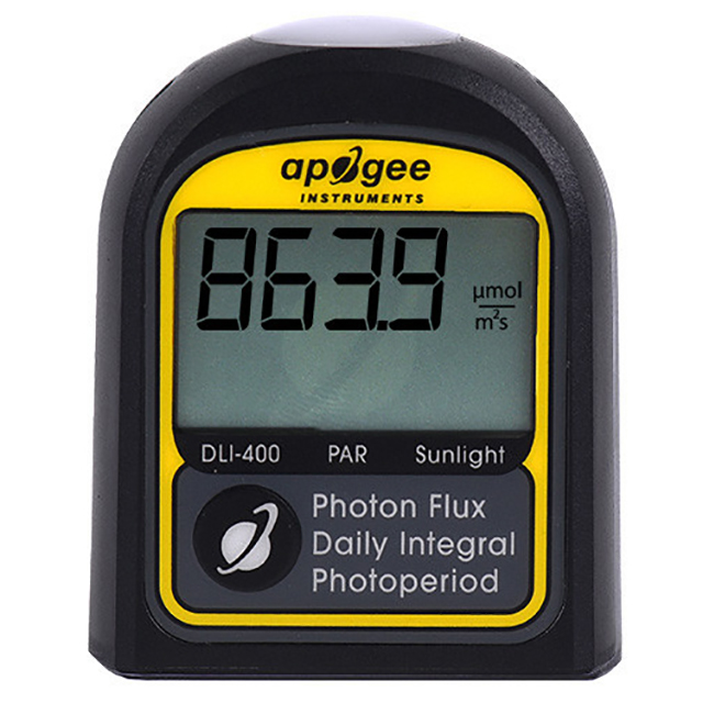 DLI-400 日光計(jì)是2022 年的新產(chǎn)品,用于抽查光合有效輻射(PAR;400–700 nm)水平并測(cè)量日光積分(DLI) 和光周期。DLI-400 是一種低成本選項(xiàng),僅在陽(yáng)光和某些寬帶光源下準(zhǔn)確。PAR、DLI 和光周期影響植物的生長(zhǎng)和發(fā)育,通常在溫室和生長(zhǎng)室中測(cè)量它們以幫助進(jìn)行光照管理和決策。DLI是指24小時(shí)內(nèi)入射在一個(gè)平面上的PAR或擴(kuò)展PAR(ePAR)的總量,單位為每天每平方米的摩爾數(shù)。光周期是 24 小時(shí)內(nèi) PAR 或 ePAR 入射的總時(shí)間,以小時(shí) (h) 為單位表示。