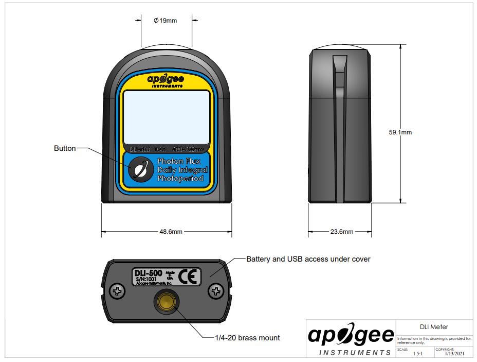 堅(jiān)固耐用且隨時(shí)可用:DLI-400 堅(jiān)固耐用,防護(hù) 等級(jí)為 IP65,可承受惡劣和潮濕的環(huán)境,可以隨身攜帶進(jìn)行抽查,直接放置在任何水平表面上,或通過(guò)連接到常用的相機(jī)三腳架、夾具或使用底部的標(biāo)準(zhǔn) ?-20 螺紋端口進(jìn)行樁子。DLI 儀表由鑄造丙烯酸擴(kuò)散器(過(guò)濾器)、光學(xué)過(guò)濾器、光電二極管、信號(hào)處理電路和安裝在 ASA 塑料外殼中的 LCD 顯示屏組成。每個(gè) DLI 包裝都包括儀表、一個(gè)保護(hù)性手提箱、兩節(jié) AAA 電池、一個(gè)快速入門(mén)說(shuō)明指南、一把螺絲刀、一個(gè)便于安裝的土壤釘和一根 USB-C 電纜,用于將儀表存儲(chǔ)的數(shù)據(jù)作為 CSV 文件下載到計(jì)算機(jī)。