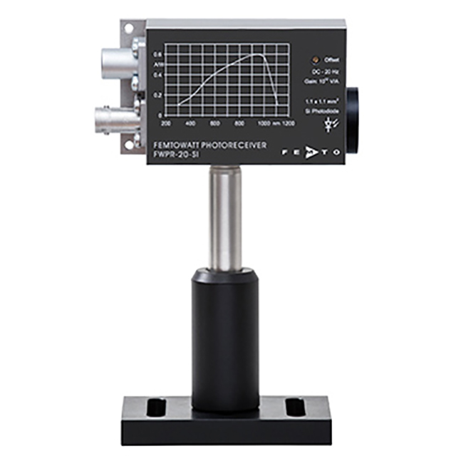 FWPR-20 系列光接收器將低噪聲 Si 或 InGaAs PIN 光電二極管與專門設(shè)計的跨阻放大器相結(jié)合,具有高達(dá) 1012 V/A的高增益和低噪聲。由于其 0.7 fW/√Hz 的極低 NEP,這種獨(dú)特的組合產(chǎn)生了具有飛瓦靈敏度的光接收器??梢灾苯訖z測低至約 50 fW 的光功率。結(jié)合可選的 FEMTO 鎖相放大器,甚至可以檢測亞飛瓦范圍內(nèi)的功率水平。