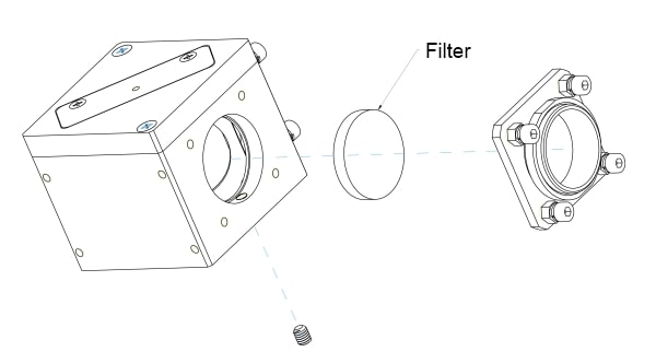 每個(gè)輸入端口都集成了一個(gè)濾光片井(見下圖),因此可以在 LED 光源和分束器之間插入 φ1“ 或 φ25mm 的濾光片。窄帶濾光片和偏振片可用于清理 LED 光譜或改變輸出光束的偏振狀態(tài)。以下是二向色鏡/分光鏡安裝到光束合光鏡立方體中的尺寸要求: