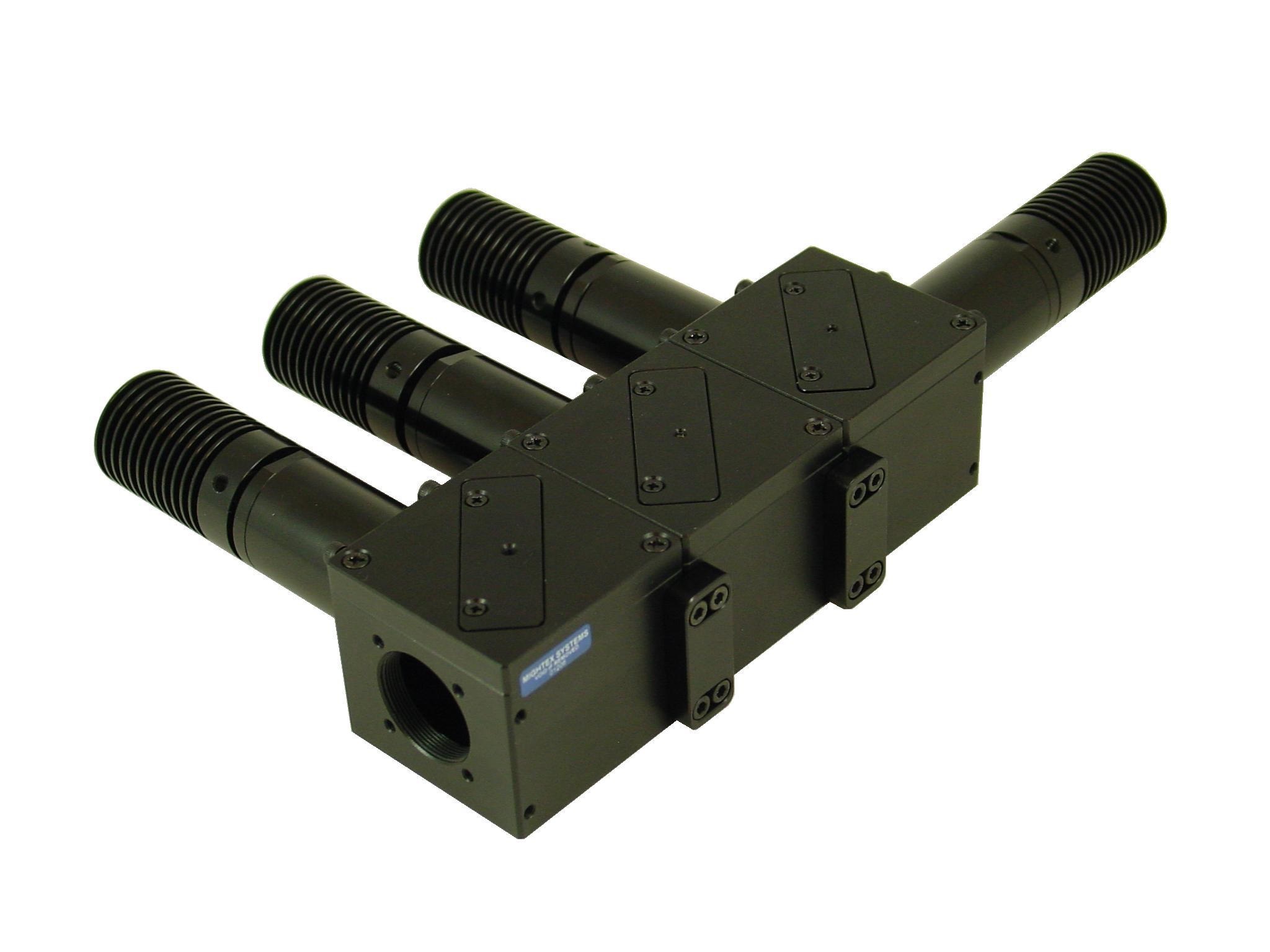 光束耦合器包括多個(gè)安裝孔和螺紋,因此可以很容易地集成到系統(tǒng)中。每個(gè)輸入端口都具有精細(xì)的 2 軸傾斜調(diào)整功能,以允許 LED 準(zhǔn)直器源相對(duì)于系統(tǒng)光軸精確對(duì)準(zhǔn)。此外,還提供了一個(gè)堅(jiān)固的鎖定機(jī)構(gòu),以保持長(zhǎng)期對(duì)齊。此外,還提供適配器,用于與主要品牌的顯微鏡耦合。