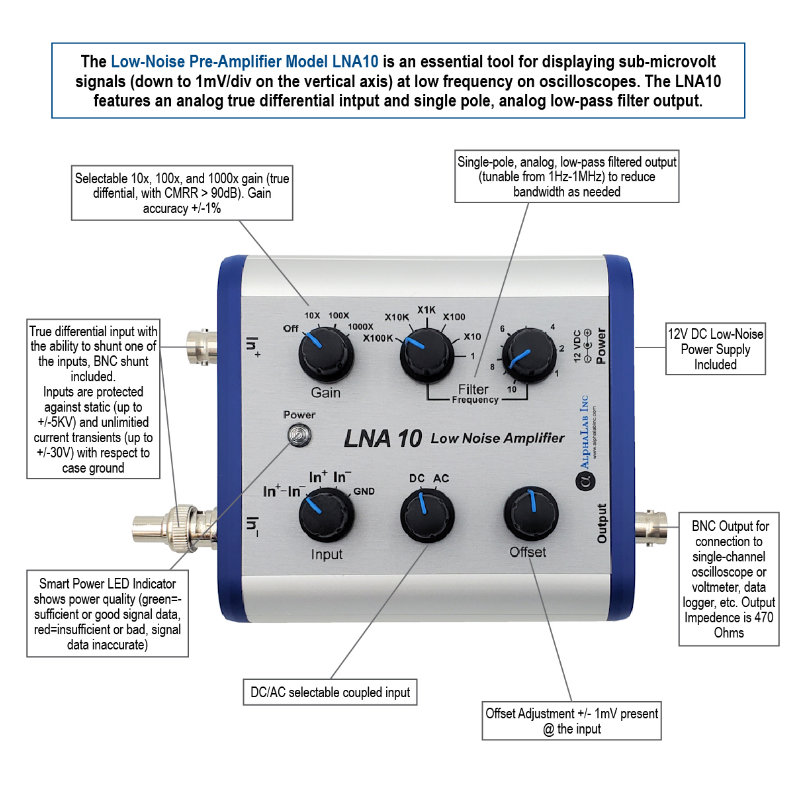 使用此前置放大器,可以在示波器上顯示亞微伏信號(hào),而這些信號(hào)在垂直軸上通常只能下降到 1mV/div。前置放大器包括一個(gè)模擬真差分輸入和一個(gè)模擬低通濾波器(可調(diào)諧 1Hz-1MHz)。f >100Hz 的輸入?yún)⒖?RMS 噪聲頻譜為 4 nV/√Hz 或更低,因此,例如,即使增益為 1000 x,從 100 Hz 到 1000 Hz 的總噪聲在 1mV 上也小于 1 div 峰峰值/div 垂直范圍設(shè)置(假設(shè)為低阻抗輸入)。大多數(shù)示波器設(shè)計(jì)用于顯示高頻(快速)事件,這些事件本質(zhì)上可能具有毫伏或更高的噪聲。然而,低頻信號(hào)的固有噪聲要小得多,因此低噪聲前置放大器和帶寬限制濾波器對(duì)于低頻小信號(hào)至關(guān)重要。* 大多數(shù)放大器在 ~1000 Hz 以上的所有頻率下都具有白噪聲頻譜(平坦的頻譜曲線)。此白噪聲頻譜通常指定為每√Hz 一定數(shù)量的 nV。然而,與典型的無源電阻器不同,固態(tài)放大器的等效輸入噪聲頻譜(以 nV/√Hz 為單位)在低頻時(shí)變得更高。對(duì)于 f ≤ 10Hz ,nV/√Hz 的數(shù)量通常與 ~1/f 成正比。下表顯示了 LNA 10 在不同頻率范圍內(nèi)的實(shí)際噪聲。在所有頻率下,LNA 10 的噪聲都比典型的固態(tài)放大器低得多。