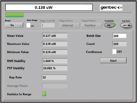 如果您需要測量從皮瓦到毫瓦的較低功率級別,我們推薦 PH 或 PH-B 探測器。在左側所示的軟件屏幕中,我們提供了一個在“統(tǒng)計數據”顯示模式下工作的數據集。我們已在手動重置模式下將批次大小設置為 100 個數據點。您可以看到實時功率(138 毫微瓦)和其他全部統(tǒng)計數據:平均數、大值、小值、均方根和 PTP 穩(wěn)定性。在左下角處,顯示的波長為 300 納米。您可在此輸入激光器波長并使用波長糾正系數。