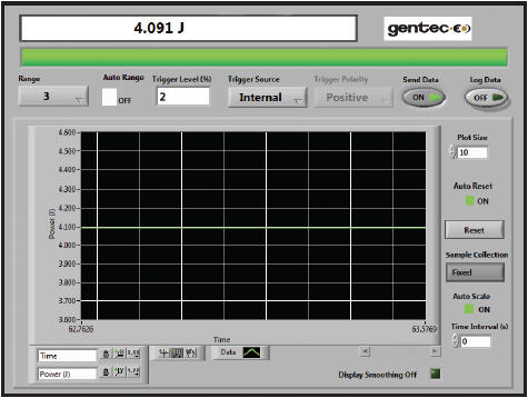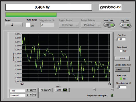 您可以選擇我們提供的任意感溫探測器測量從幾微瓦到 30 千瓦的激光器功率。我們使用我們制造的靈敏度高的一款熱電堆探測器,即 XLP12-3S-H2 型,生成了左圖所示的軟件屏幕。我們選擇的是“示波器”模式,您可以在此監(jiān)控功率,并同時查看實時功率讀數(0.404 瓦)、條形圖和帶狀圖。通過此屏幕還可訪問量程、觸發(fā)器、自動刻度和很多其他監(jiān)視功能。