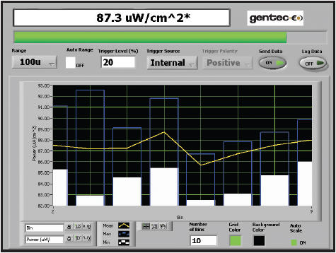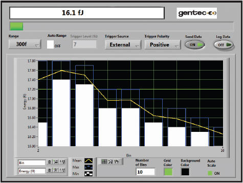 對于從 fJ 到 μJ 量程以及從紫外線到近紅外線的測量,我們建議使用 PE3B-Si 探測器。它使用低端能量探測器技術。另外 M-LINK 還使用了脈沖平均和降噪技術,為您提供各種優(yōu)勢。在右側示例中,我們在“平均值”模式下工作并捕獲了一個數據集。條形分別代表?。ò咨┖痛螅ㄋ{色)能量值。帶狀圖根據平均能量值繪制而成。您需要選擇此處給出的“BINS”數?!敖y(tǒng)計數據”屏幕中提供了“脈沖平均”功能。