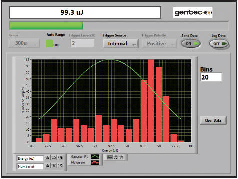 您可以選用我們提供的多款 QE 系列大面積熱釋電探測器,對從 50 nJ 到 250 J 以及從紫外線到遠紅外線的能量進行測量。為演示此功能,我們選用 QE8SP-B-BL 和 M-LINK。通過“直方圖”屏幕,可以繼續(xù)查看實時測量值、顯示數據集能量分布的直方圖以及擬合高斯曲線。請注意,您仍然可以訪問量程、觸發(fā)器、波長等儀器控制值。