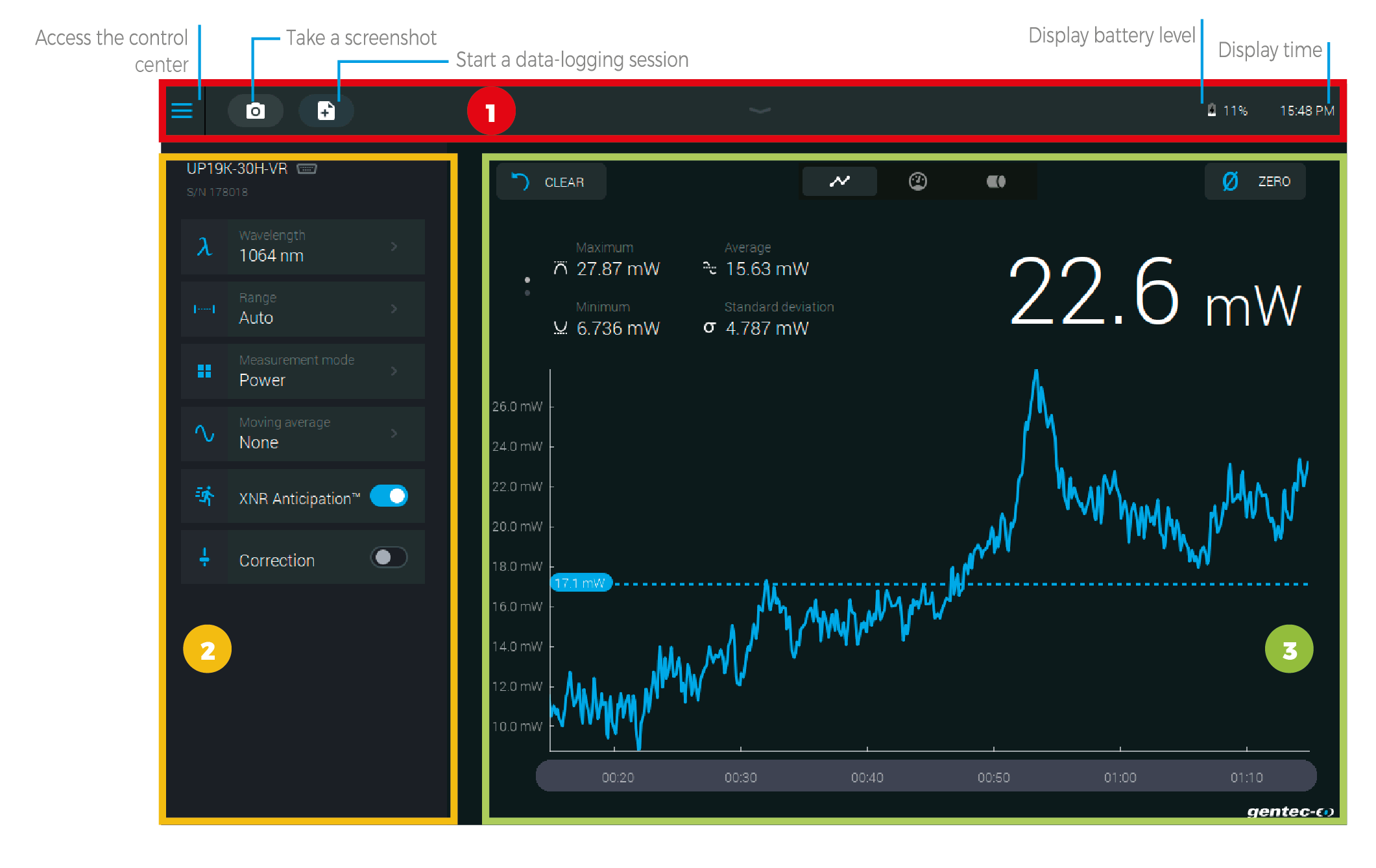 1 - 導航欄 —— 在屏幕頂部,有直接進入控制中心的通道、數(shù)據(jù)采集按鈕和各種指示值(電池電量和時間)。