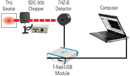 這是一種基本模擬設(shè)置,在輻射源的光功率約為 5 微瓦或更大的情況下比較有用。在 5 赫茲斬波頻率下,THZ5B-BL-DA 探測器的輸出約為 600 毫瓦,可為示波器提供充足的信號。只需讀取電壓輸出,再除以探測器的 Rv 系數(shù) (V/W),即可測量出輻射源的強(qiáng)度(單位:瓦)。在特定情況下,還可考慮使用波長糾正系數(shù)。