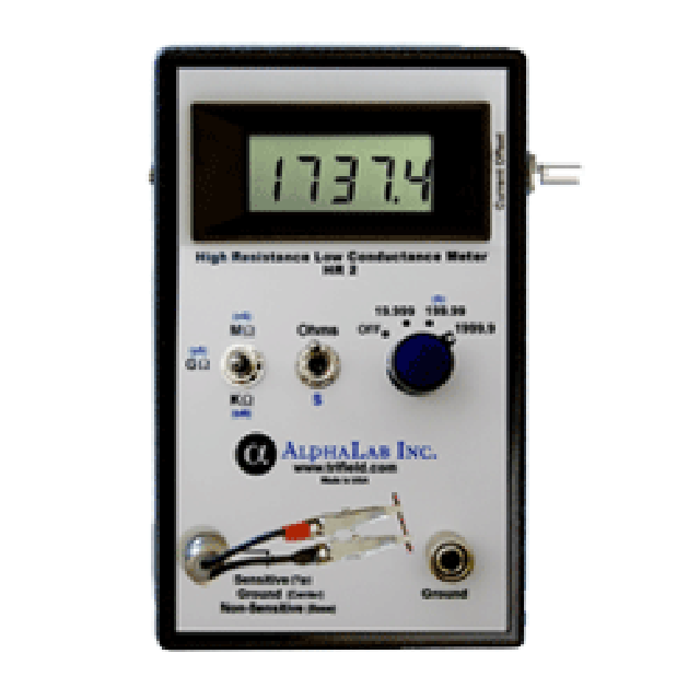 The Model HR2 meter measures resistance in nine ranges from 1 ohm to 1.9999 Tera ohms (1.9999×1012ohms), and conductance in a single range of 0.00 to 199.99 pS (pico siemens, or pico mhos), all at low voltage of < 2 volts across the sample. Basic accuracy is +/- 2% of reading +/- 1 count. For resistance higher than 1.9999 Tera ohms, the conductance range can be used to measure conductance down to 0.01 pS (100 T ohms). The meter has a conductance range because samples with simultaneously high resistance and high capacitance settle faster to their final value on conductance (usually under one second), than on resistance (several seconds), and conductance is also capable of detecting higher resistance than the resistance ranges can. Note that resistance in units of T ohms is the inverse of conductance in pS, so that the resistance can be calculated from the conductance. For example, 100 pS is 0.01 T ohm (10 G ohm), and the highest readable conductance of 199.99 pS is essentially 5 G ohms.