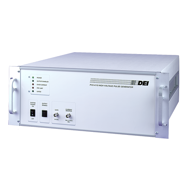 The PVX-4110 pulse generator is a direct coupled, air cooled, solid state half-bridge (totem pole) design, offering equally fast pulse rise and fall times, low power dissipation, and virtually no over-shoot, undershoot or ringing. It has overcurrent detection and shutdown circuitry to protect the pulse generator from potential damage due to arcs and shorts in the load or interconnect cable.