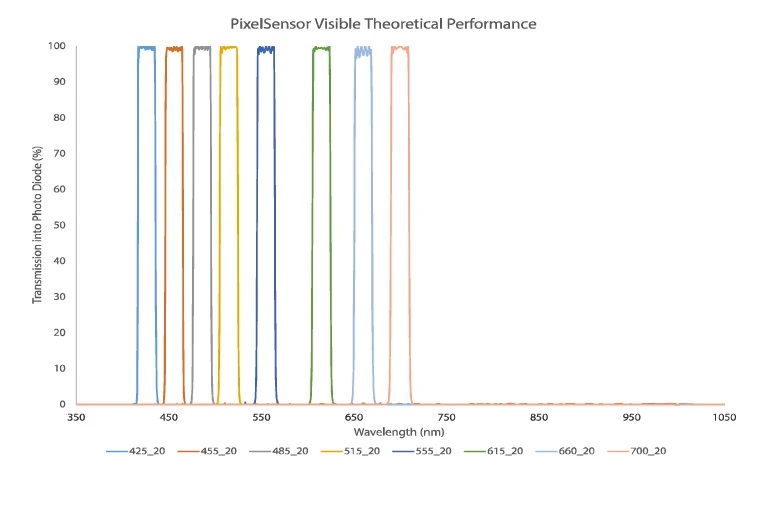 Torrent Photonics offers four variations of PixelSensor Multispectral Sensors — VIS, VIS-NIR, NIR, and PCR.