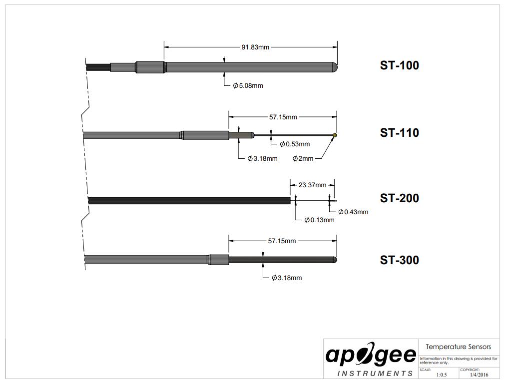 The ST-300 is a high accuracy PRT (Platinum Resistance Thermometer),(1/10 DIN) designed to minimize solar load and thermal mass. White heat shrink is used on the cable behind the PRT to reduce solar load. PRT sheath dimensions are 3.18 mm diameter and 63.5 mm length, minimizing thermal mass.