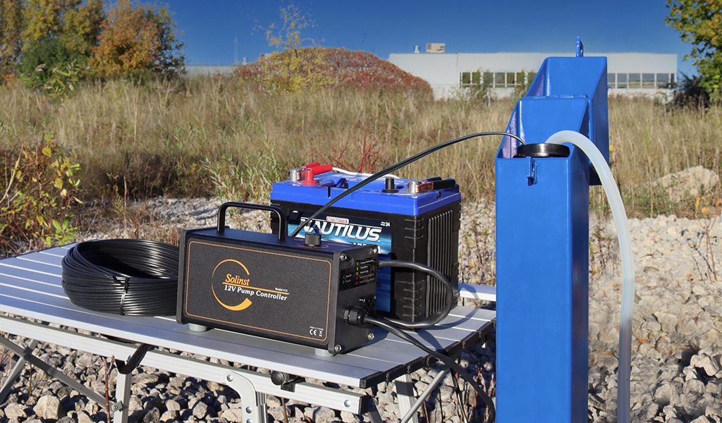The Solinst 12V Submersible Pump is capable of pumping groundwater from 36.5 m (120 ft.) below ground surface, with flow rates up to 13.5 L/min (3.6 US gpm) in shallow conditions. The continuous flow rate is very simple to adjust using the 12V Pump Controller's single dial. The 12V Submersible Pump's sleek, short (nominal 6") design means it fits easily down wells that may not be straight, without hang-ups.